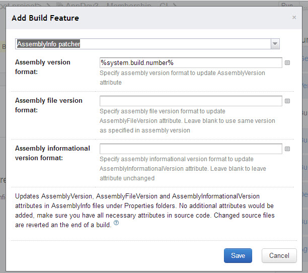 I wasn’t aware that the Additional Build Feature functionality existed until I researched assembly versioning with Team City. I came across the AssemblyInfo Patcher feature in the Team City documentation. If you have created your application using standard Visual Studio solutions and projects then all your projects contain an AssemblyInfo.cs class in the Properties folder. This file contains information about your assembly that is used to define its file properties during compilation. It also holds information about paths to embedded resources as well as other compilation options for your assembly.