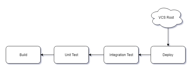 This diagram shows how this might work using artifact dependencies and VCS Finish Build triggers. The arrows show the direction of the triggers, as each build completes it then triggers the next build in the chain. A change in the VCS root triggers the initial build step, which triggers the unit test step, which triggers the integration test step, and then finally the deployment step. As each step in this chain finishes, it triggers the next step and passes the artifacts to it. If we want to ensure that Build, Unit Test, and Integration Test builds complete before we deploy our application, then they will need to be done serially as depicted by the diagram.